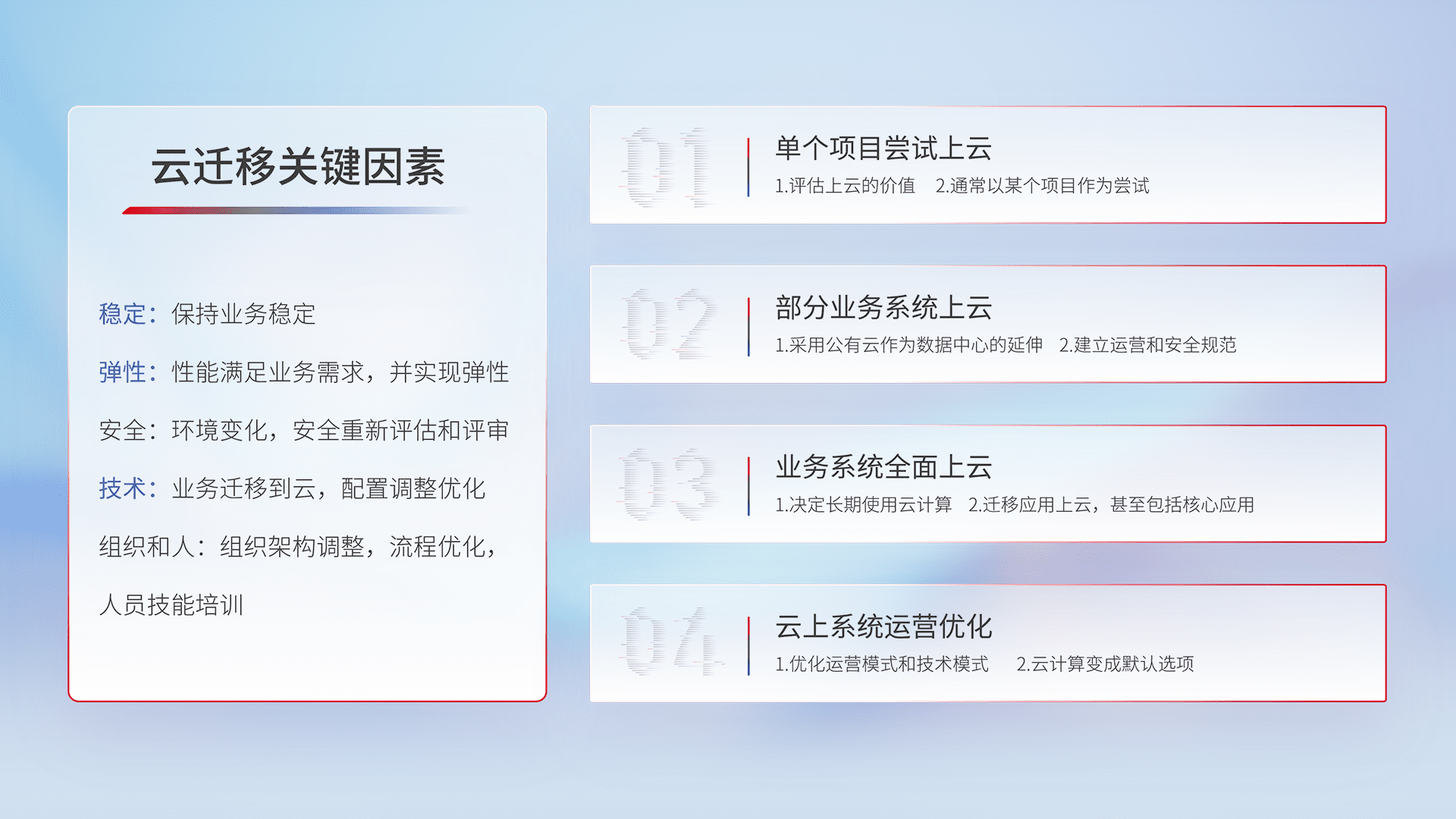 结合实际业务,,,从规划设计、、、云平台选型、、云原生改造、、、数据迁移、、集成交付,,,,迁移全过程为客户识别最佳上云路径,,,做好风险识别管理,,,,设计网络架构、、、、身份权限、、、、安全审计合规、、、、操作审计、、、日志审计、、监控告警策略、、、多站点容灾设计等,,对云上基础设施进行整体规划,,,提升IT治理水平,,,,以满足弹性、、高可用、、、、高性能的需求。。