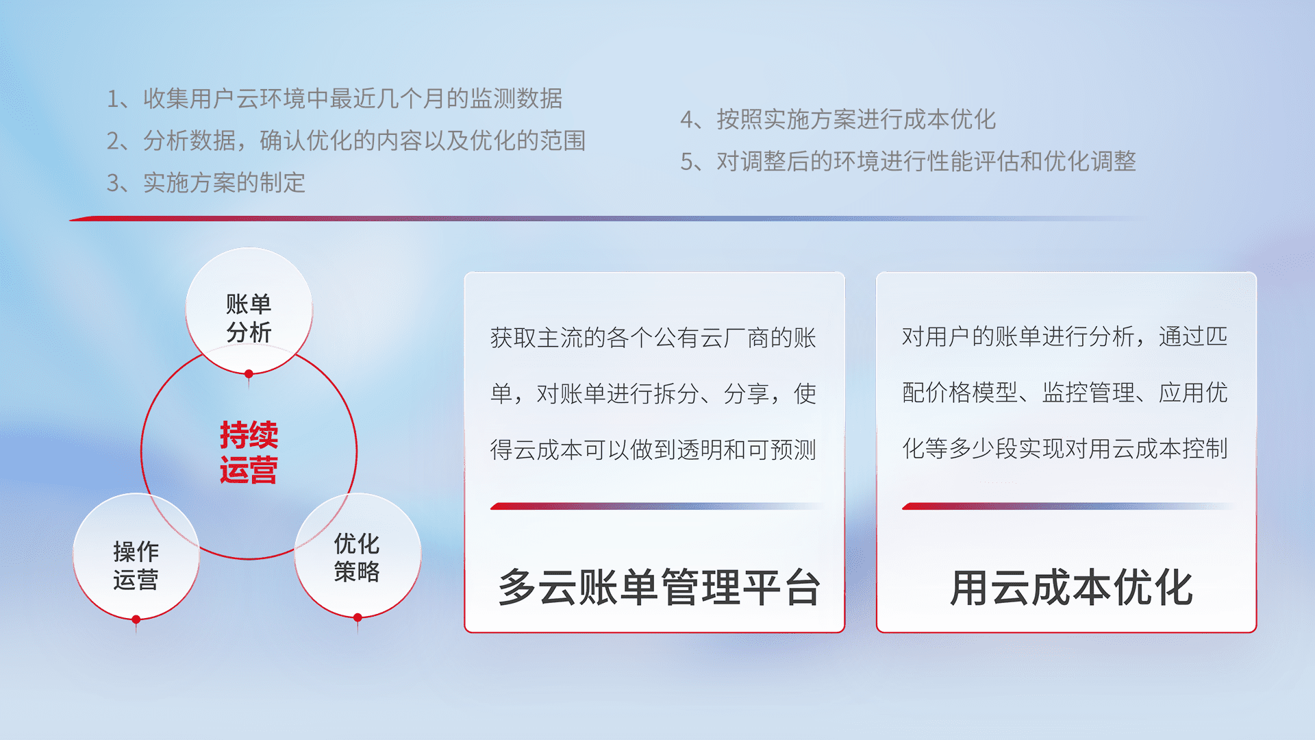 通过灵活运用多种自动化迁移工具,,,,帮助企业用户实现业务和数据高效 、、稳定的上云迁移和云上迁移,,采用自研多云纳管平台,,,,以中立管理模式,,,解决多组织、、多云、、多运维厂商的复杂关系的管理,,,保证多云平台资源配置的一致性,,,,实时掌控云资源运行数据,,,运用智能化工具分析云资源多云平台的管理服务,,透明化管理成本支出,,,用云成本可预测、、、用云费用可优化、、云资源配额有据可依。。。