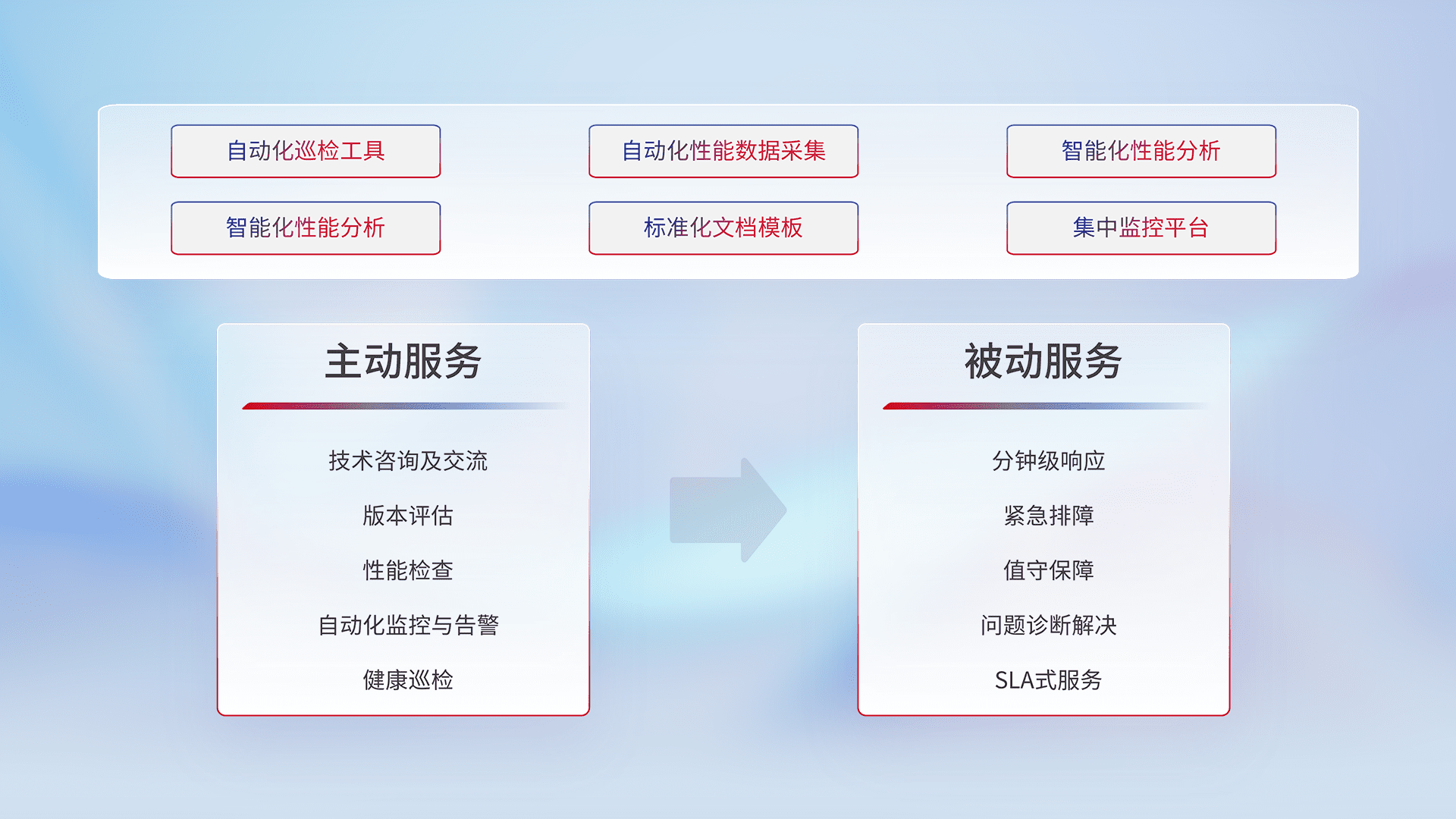 智能化工具和标准化文档,,,保障服务质量,,,,提供主动服务(包含技术咨询、、版本评估、、、、性能检查、、、、自动化监控与告警、、健康巡检)和被动服务包含(分钟级响应、、、紧急排障、、、、值守保障、、问题诊断解决、、SLA服务)。。。